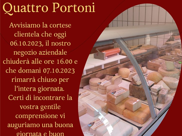 Avvisiamo i gentili clienti di una temporanea modifica del normale orario di apertura della nostra formaggeria. Ringraziandovi per la cordiale comprensione, ci rivedremo regolarmente martedì! #quattroportoni #quattroportonicaseificio #for...